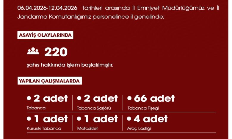 Hafta boyunca yürütülen titiz çalışmalar neticesinde asayiş suçlarından 220 şahıs hakkında işlem başlatıldı. Yapılan aramalarda 2 adet tabanca, 2 adet şarjör, 66 adet fişek, 1 adet kurusıkı tabanca, 1 adet motosiklet ve 4 adet araç lastiği ele geçirildi. Ayrıca: