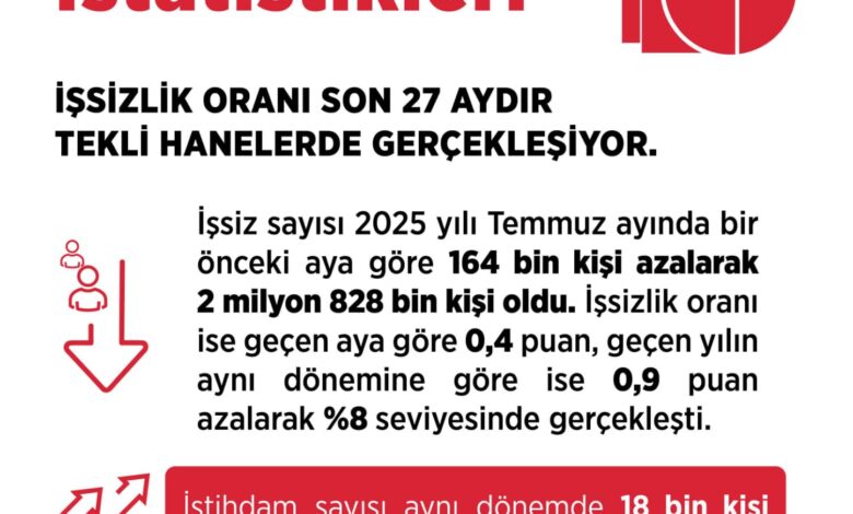Bakan Işıkhan, sosyal medya hesabından yaptığı paylaşımda, “İşsiz sayısı Temmuz 2025’te bir önceki aya göre 164 bin kişi azalarak 2 milyon 828 bin kişi oldu. İşsizlik oranı ise geçen aya göre 0,4 puan, geçen yılın aynı dönemine göre 0,9 puan azalarak yüzde 8 seviyesinde gerçekleşti. 27 aydır tek haneli seviyelerde gerçekleşen işsizlik oranı, Orta Vadeli Program (OVP) ve diğer politikalarımız ile uyumlu seyretmektedir” ifadelerini kullandı.