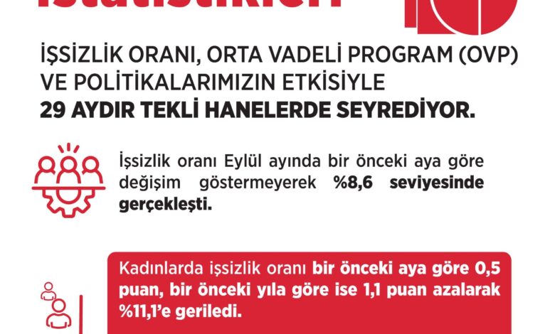 Bakan Işıkhan, sosyal medya hesabından yaptığı paylaşımda, Orta Vadeli Program (OVP) ve çalışma hayatına yönelik politikaların etkisiyle işsizlik oranının eylül ayında bir önceki aya göre değişmeyerek yüzde 8,6 seviyesinde gerçekleştiğini bildirdi.