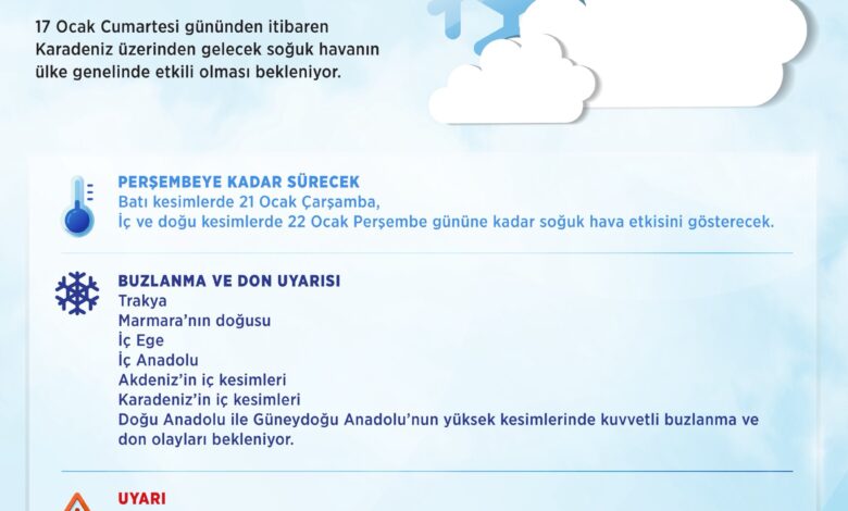 Meteoroloji Genel Müdürlüğü’nün son hava tahmin raporlarına göre; 17 Ocak Cumartesi günü itibarıyla ülke genelinde sıcaklıklar hissedilir derecede düşecek. Soğuk hava dalgasının yurdun batı bölgelerinde 21 Ocak Çarşamba, iç ve doğu kesimlerde ise 22 Ocak Perşembe gününe kadar etkili olmaya devam etmesi bekleniyor.