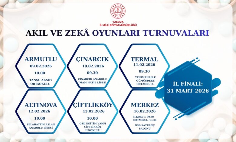 Yalova İl Milli Eğitim Müdürlüğü, öğrencilerin bilişsel becerilerini geliştirmek ve rekabet ruhunu desteklemek amacıyla düzenlenen Akıl ve Zekâ Oyunları Turnuvaları için hazırlıkların tamamlandığını duyurdu. “Geri sayım başladı” ifadesiyle duyurulan organizasyonda, zekâ, strateji ve azmin sahneye çıkacağı vurgulandı.